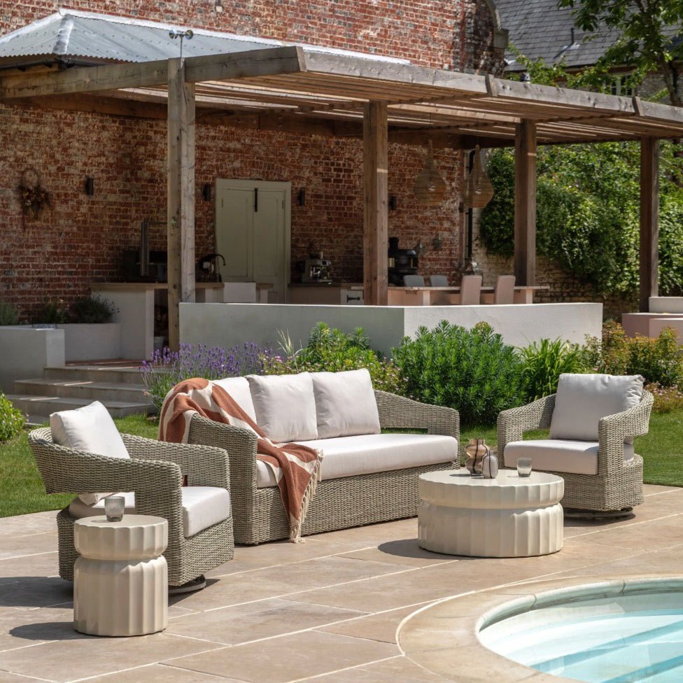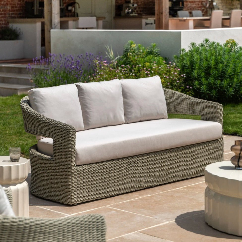Designed for outdoor comfort and style, the Hvar 3 Seater Sofa combines wicker framing with generously padded cushions to create an inviting retreat for your garden or patio. Its versatile grey finish seamlessly integrates with any outdoor setting, whilst robust construction guarantees lasting durability and performance. Ideal for intimate gatherings or peaceful moments with loved ones, this sofa brings refined elegance to your exterior living area.
