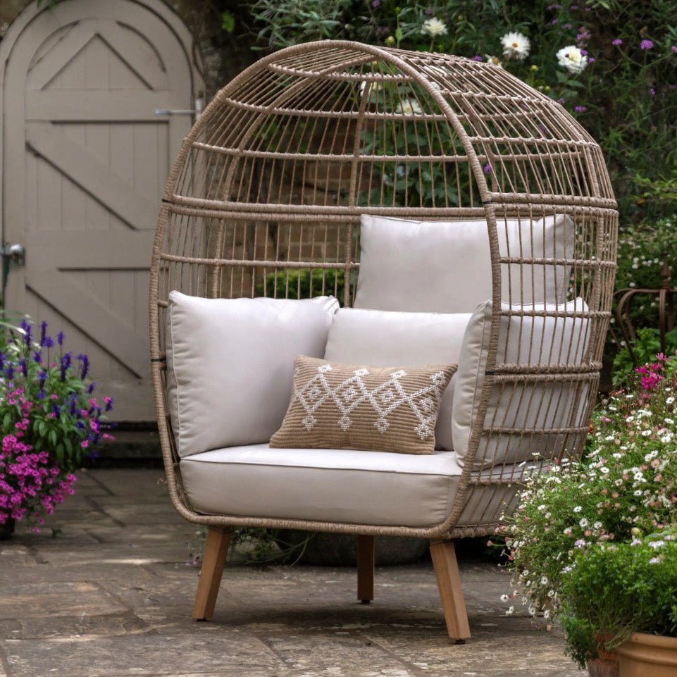 Expertly crafted using a combination of natural wicker and plush cushions, this chair provides a cosy and peaceful sanctuary for moments of relaxation. Its design adds a charming touch to any patio or garden, while the cushioned seating guarantees hours of uninterrupted comfort.