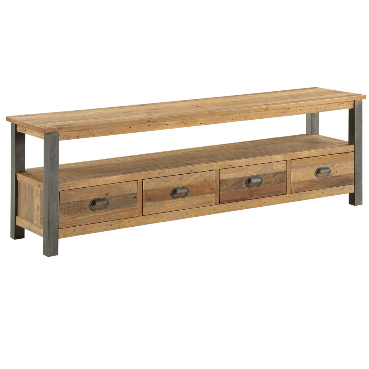 This large Urban Elegance reclaimed TV cabinet features a long open shelf and four drawers. The distressed, powder coated steel frame ensures an attractive matt finish, which combines beautifully with the solid reclaimed rough sawn wood. Featuring a stylish cross design in the frame, these pieces will be a focal point in any room.