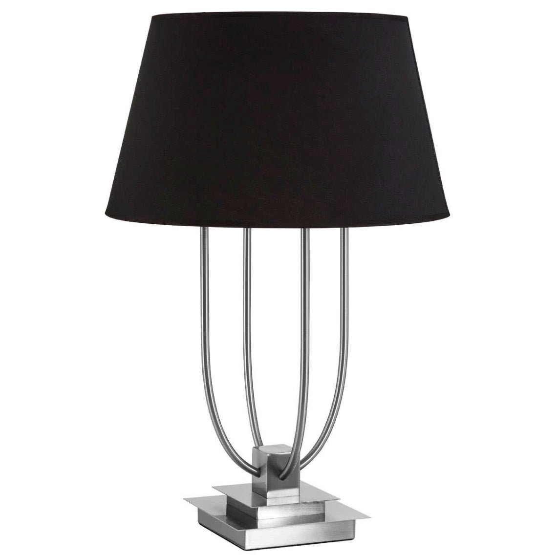 This elegant black and silver Regents Park lamp adds a sophisticated Boutique touch to any living room. Its metal base is finished in refined satin nickel. Four slender, curved arms rise from the base, providing a graceful contrast to the base’s angular structure.