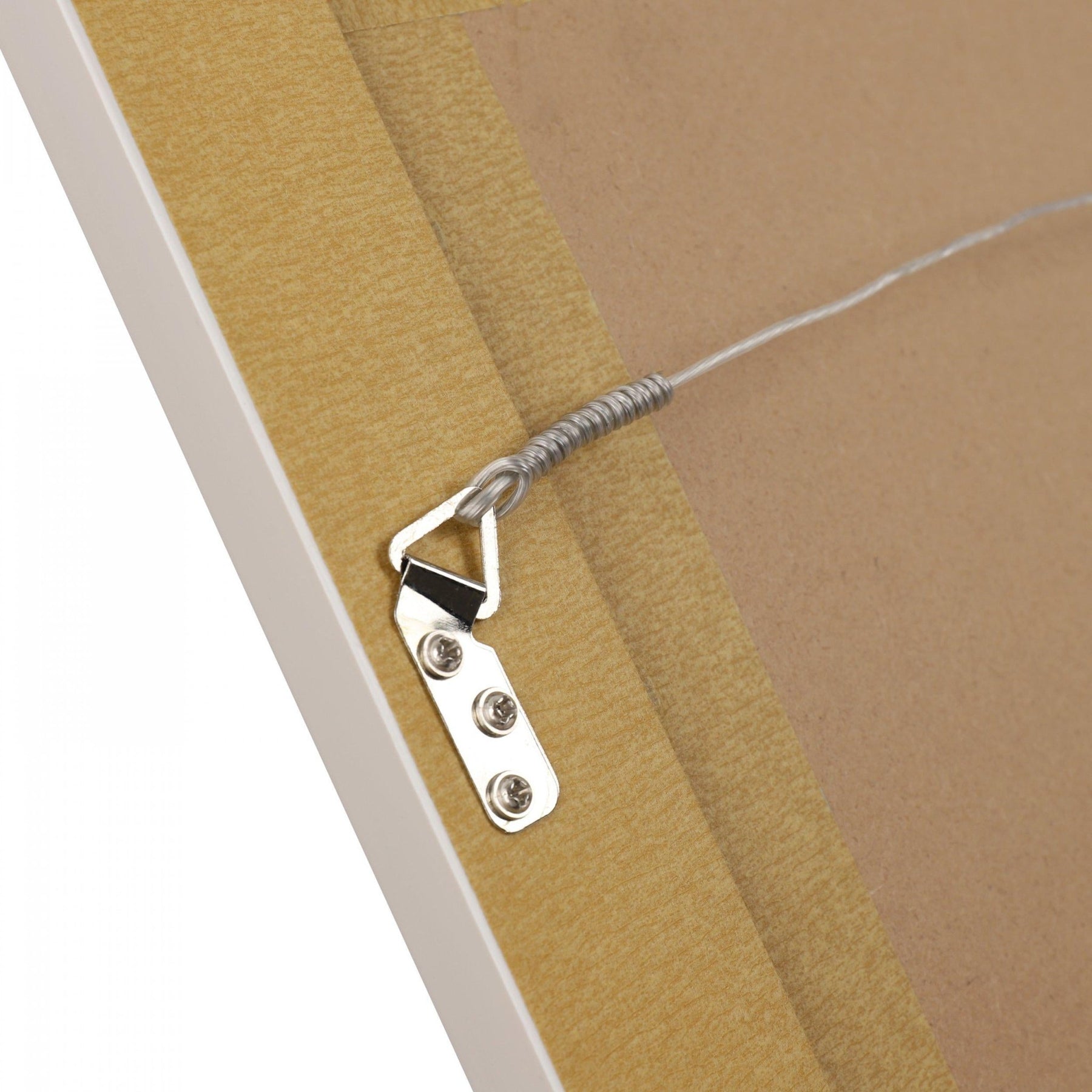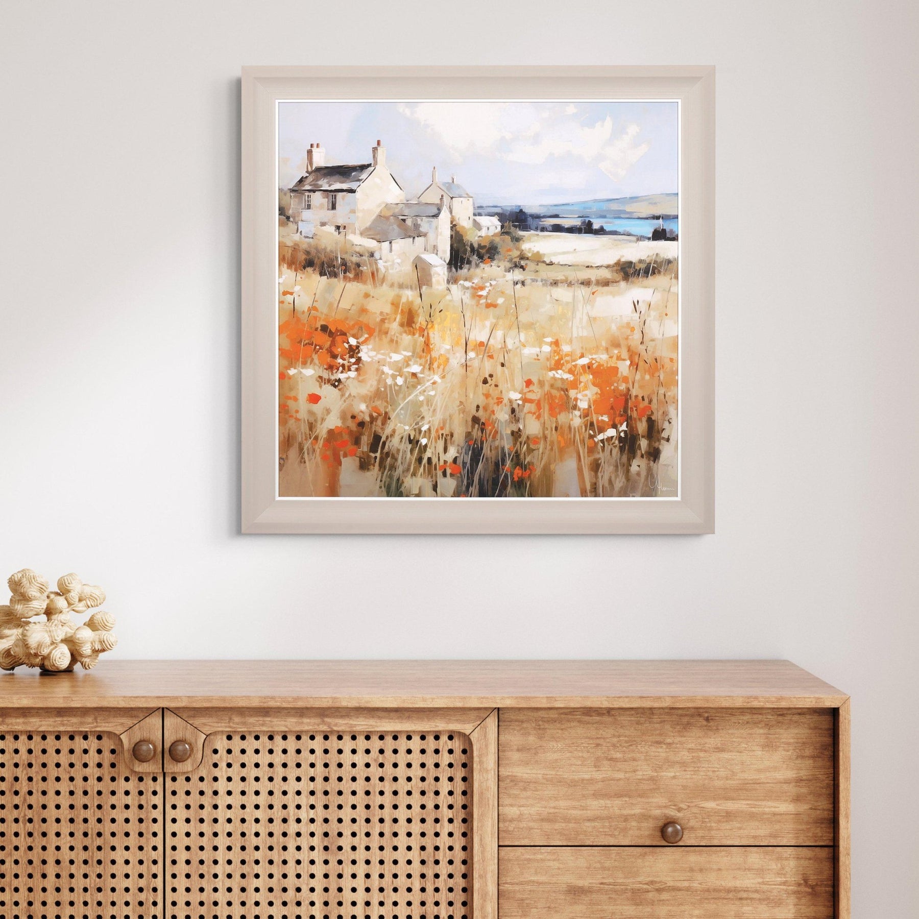 Nestled amongst the vibrant wildflowers, a charming group of stone farmhouses coexists peacefully with the surrounding natural beauty. Tucked away in a secluded cove, the sprawling acreage soaks up the last of summer's warmth. Artist Ulyana Hammond expertly captures the idyllic scenery using delicate brushstrokes and a palette of soft pastel tones. The delightful shades of orange, peach, and cream beautifully enhance the coastal vista. The unglazed wall art is elegantly framed in a decorative grey with a white inner border.