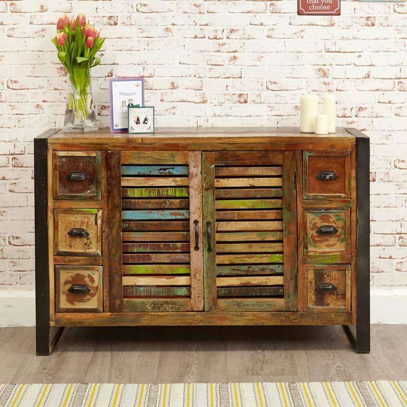 The Urban Chic contemporary range is made using reclaimed wood salvaged from India. Some of the wood used can range between 50 and 150 years old and is assembled by skilled craftsmen who create this colourful and interesting furniture. As each piece in the range is hand finished using a unique blend of reclaimed timbers whether it's a coffee table, dining table or shelving unit. A beautifully made steel outer frame gives a fantastic urban edge and offers great structural rigidity.