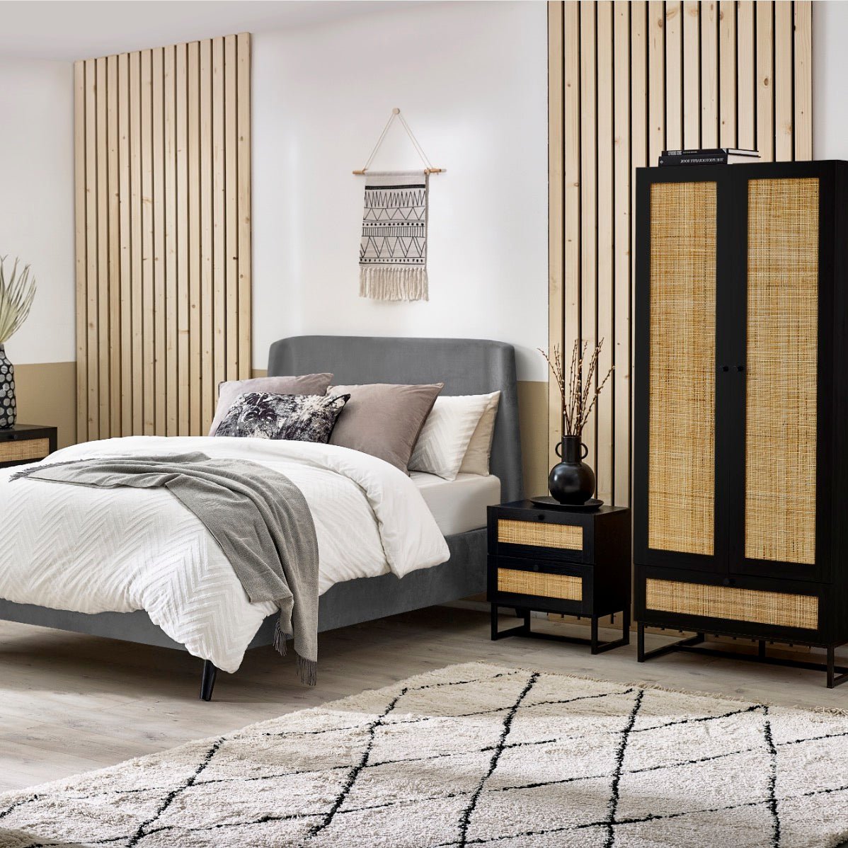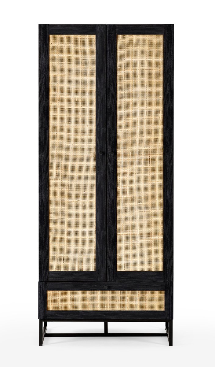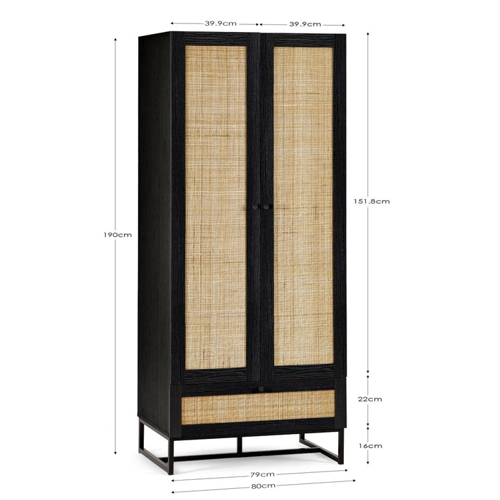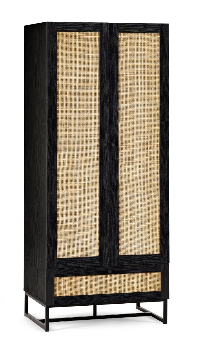 The Padstow Double Wardrobe in black by Julian Bowen has a lower drawer for additional hidden storage. It seamlessly combines contemporary construction with vintage design elements, resulting in a stunning addition to any home decor. Its industrial-style base, along with the natural rattan fronts, creates a unique blend of warmth and sophistication. This versatile piece is also offered in an oak finish. Please note - full assembly is required.