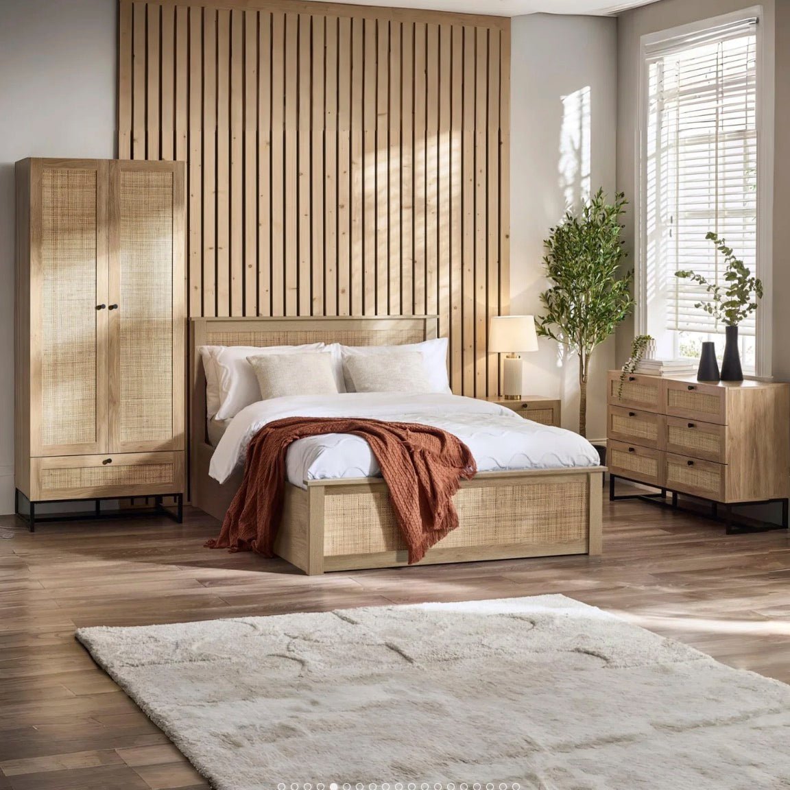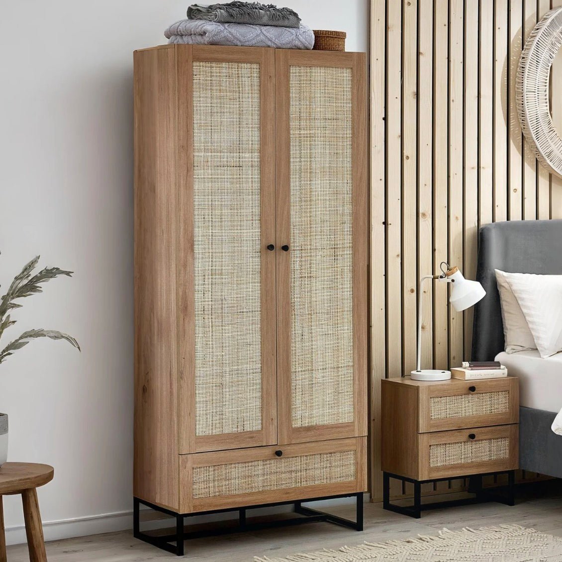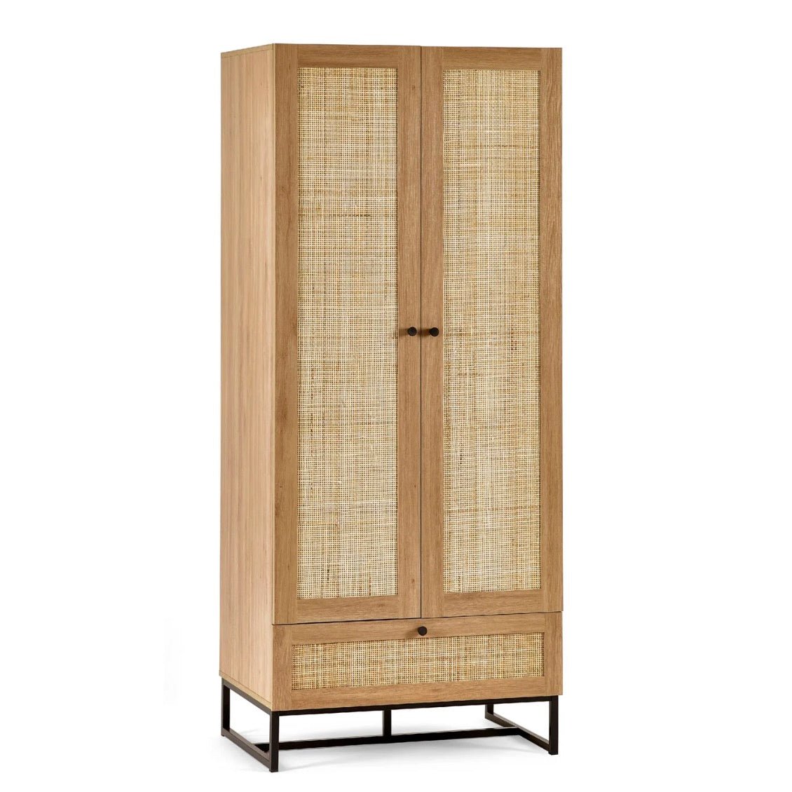 The Padstow Double Wardrobe in Oak by Julian Bowen has a lower drawer for additional hidden storage. It seamlessly combines contemporary construction with vintage design elements, resulting in a stunning addition to any home decor. Its industrial-style base, along with the natural rattan fronts, creates a unique blend of warmth and sophistication. This versatile piece is also offered in a black finish. Please note - full assembly is required.