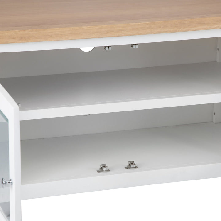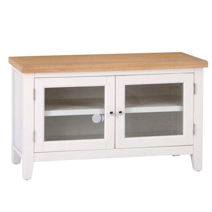 The fresh timeless style of this Windsor White TV stand in a painted finish with wooden tops and additional glazed cabinet storage can be enjoyed in interiors of all styles. The perfect way to bring a touch of class and character.