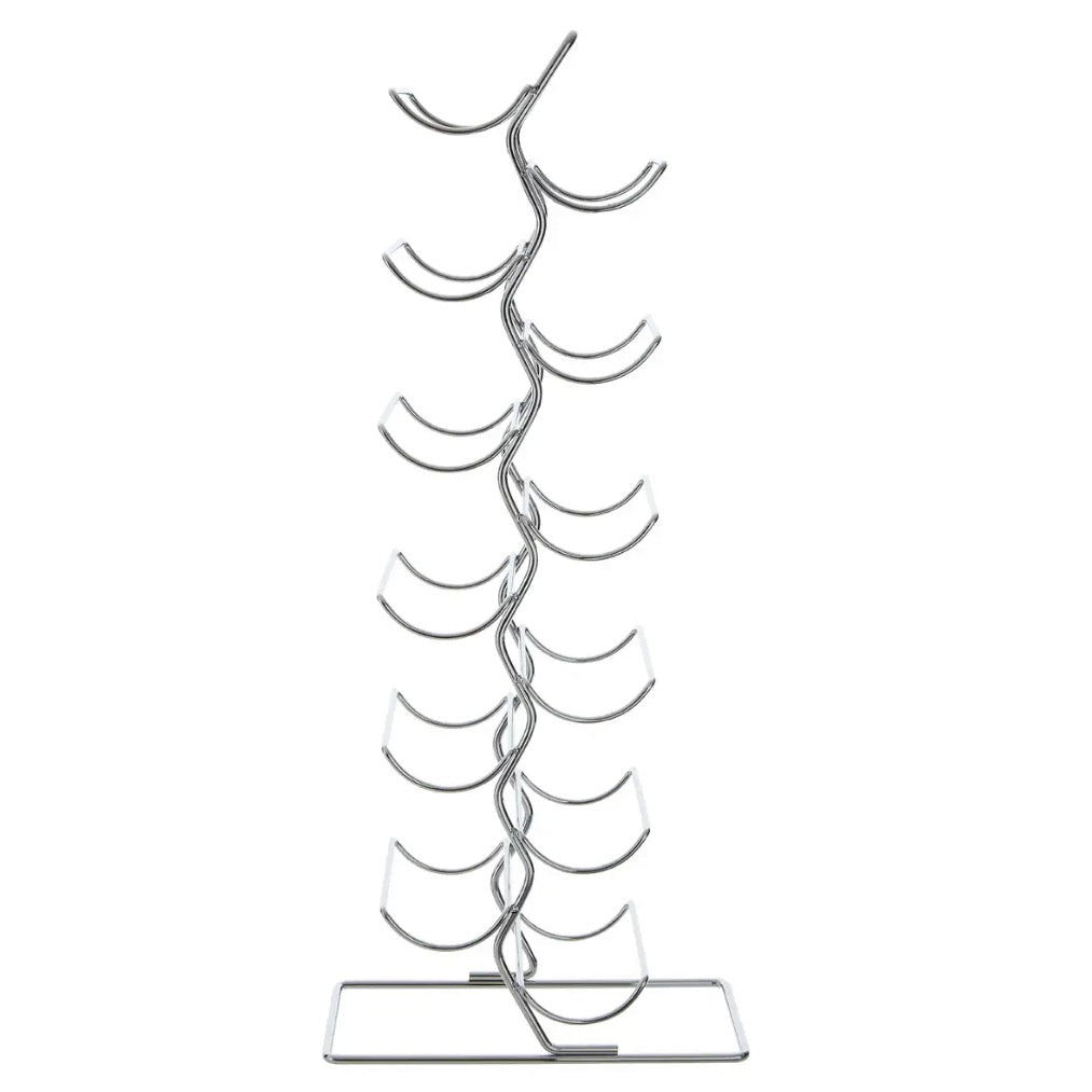 This modern chrome wine rack holds 12 bottles and combines practical storage with striking design. Its flowing structure features a central spine supporting six curved rectangular platforms on each side, ensuring bottles stay securely positioned. The broad base adds stability, while the chrome wire finish offers a polished and contemporary finish.