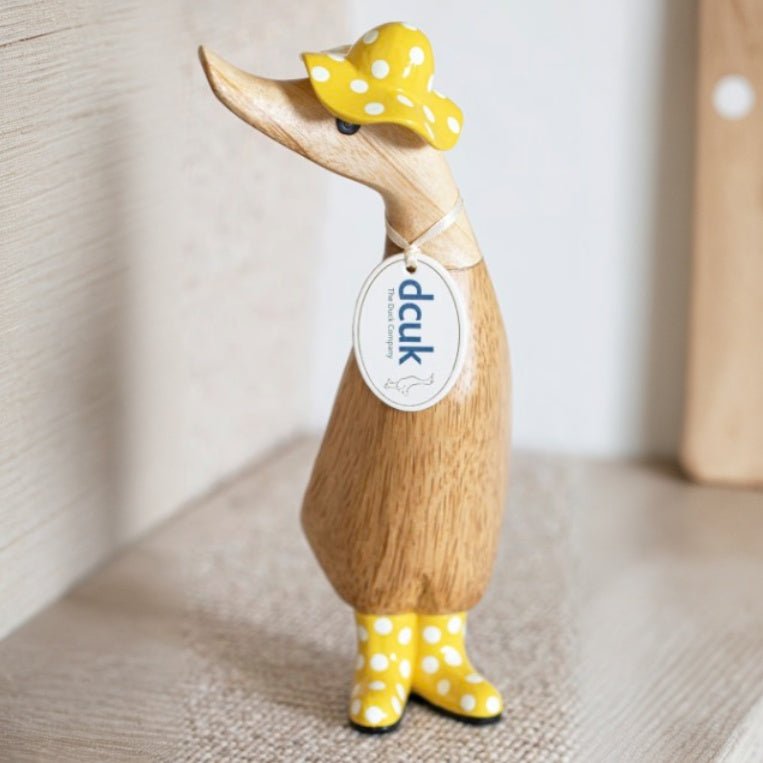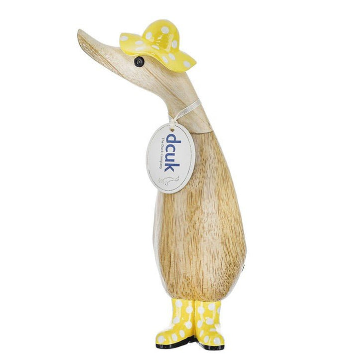 Wooden Duckling with Spotty Hat & Welly Boots - Yellow & White1 - Duck Barn Interiors