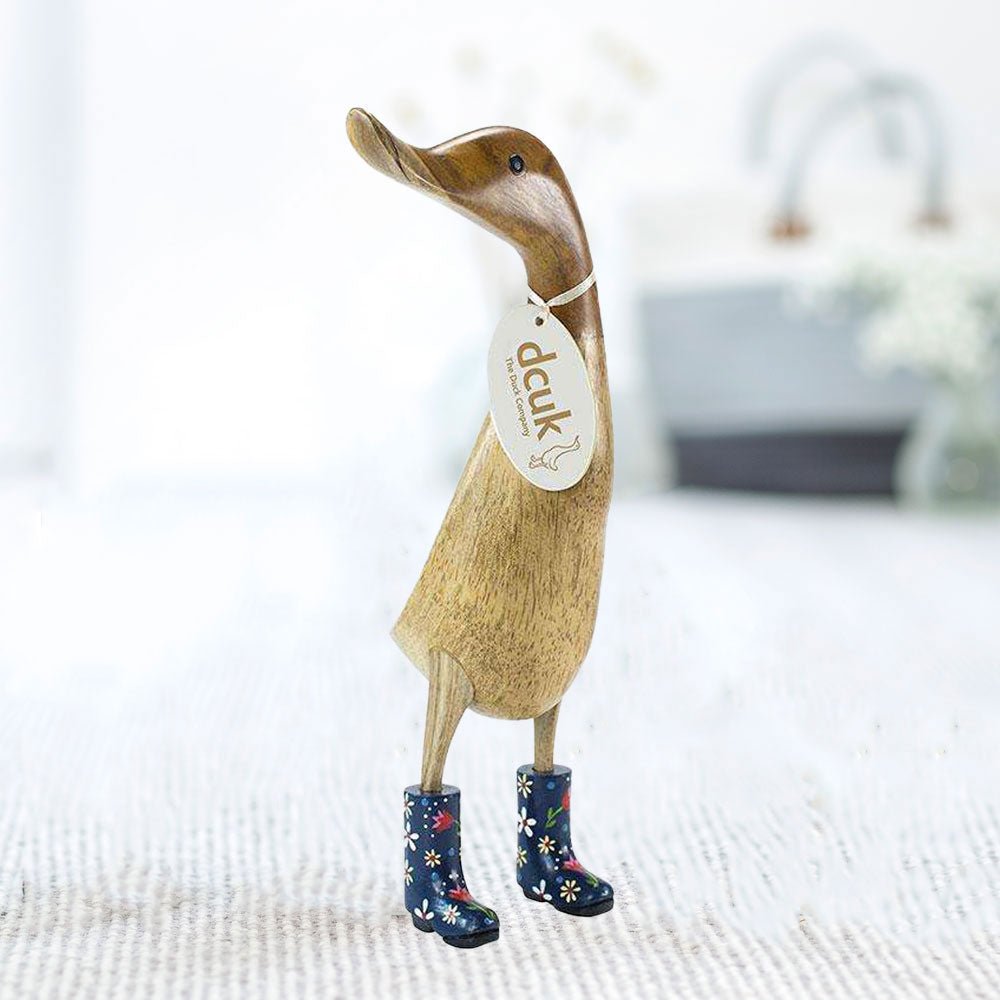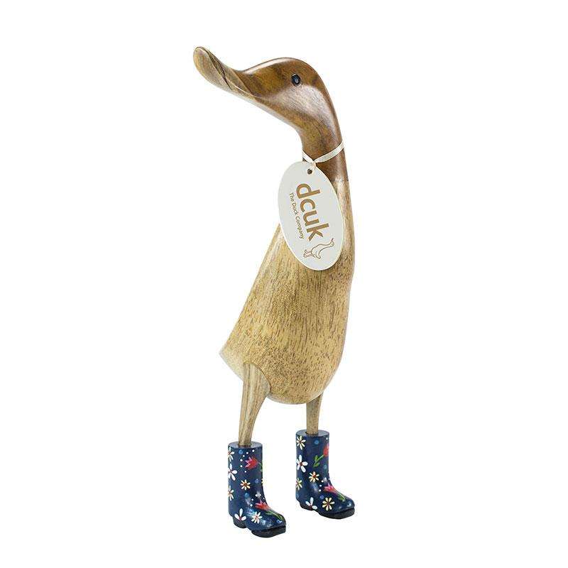 Large Wooden Duck in Blue Floral Welly Boots1 - Duck Barn Interiors