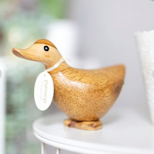 These gorgeous DCUK duckys have a simple plain natural finish.  They have different poses - looking left and right or forward.  Each duck is hand carved and hand painted. If you would like your duck to have a name tag, there is a choice of a randomly selected girl's or boy's name or a personalised printed name. The tag is tied with ribbon around the duck's neck.
