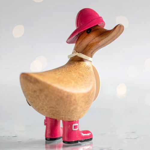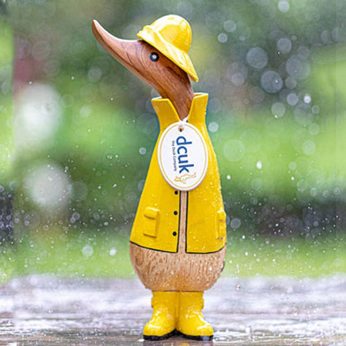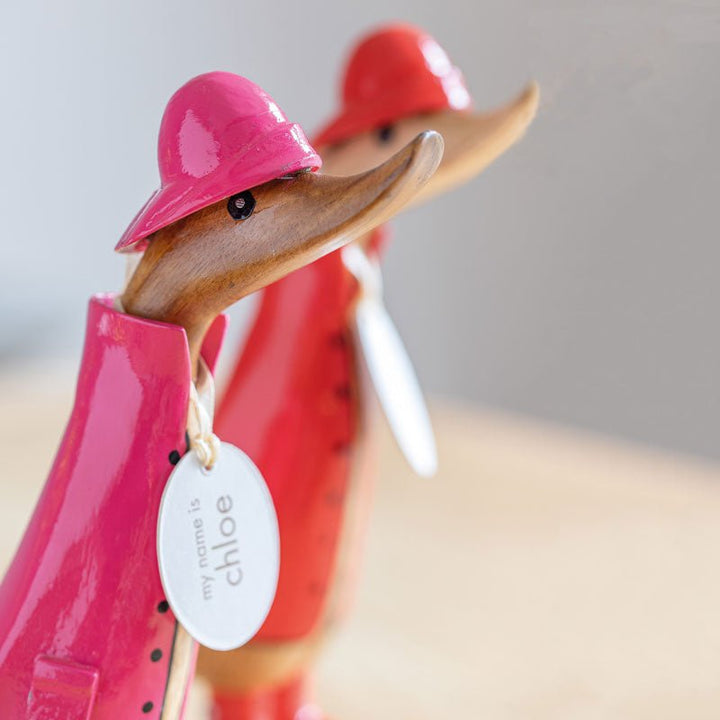 Perfect weather for ducks means the Raincoat ducklings are  all geared up and ready to go with a matching coloured rain hat.  Each duck is hand carved and hand painted. If you would like your duck to have a name tag, there is a choice of a randomly selected girl's or boy's name or a personalised printed name. The tag is tied with ribbon around the duck's neck.