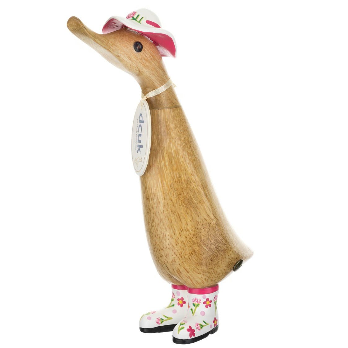 This gorgeous wooden duckling by DCUK has a pink & white floral hat and welly boots. If you would like your duck to have a name tag, there is a choice of a randomly selected girl's or boy's name or a personalised printed name. The tag is tied with ribbon around the duck's neck. Each duck is hand carved and hand painted.