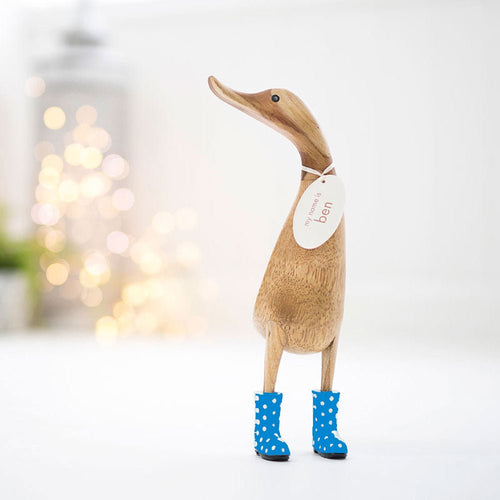 This gorgeous wooden duckling by DCUK has a blue and white spotty hat and welly boots.  If you would like your duck to have a name tag, there is a choice of a randomly selected girl's or boy's name or a personalised printed name. The tag is tied with ribbon around the duck's neck.   Each duck is hand carved and hand painted.