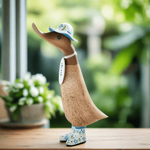 Wooden Ducky with Floral Hat & Welly Boots - Blue & White