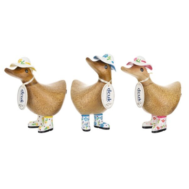 Wooden Ducky with Floral Hat & Welly Boots - Yellow & White3 - Duck Barn Interiors