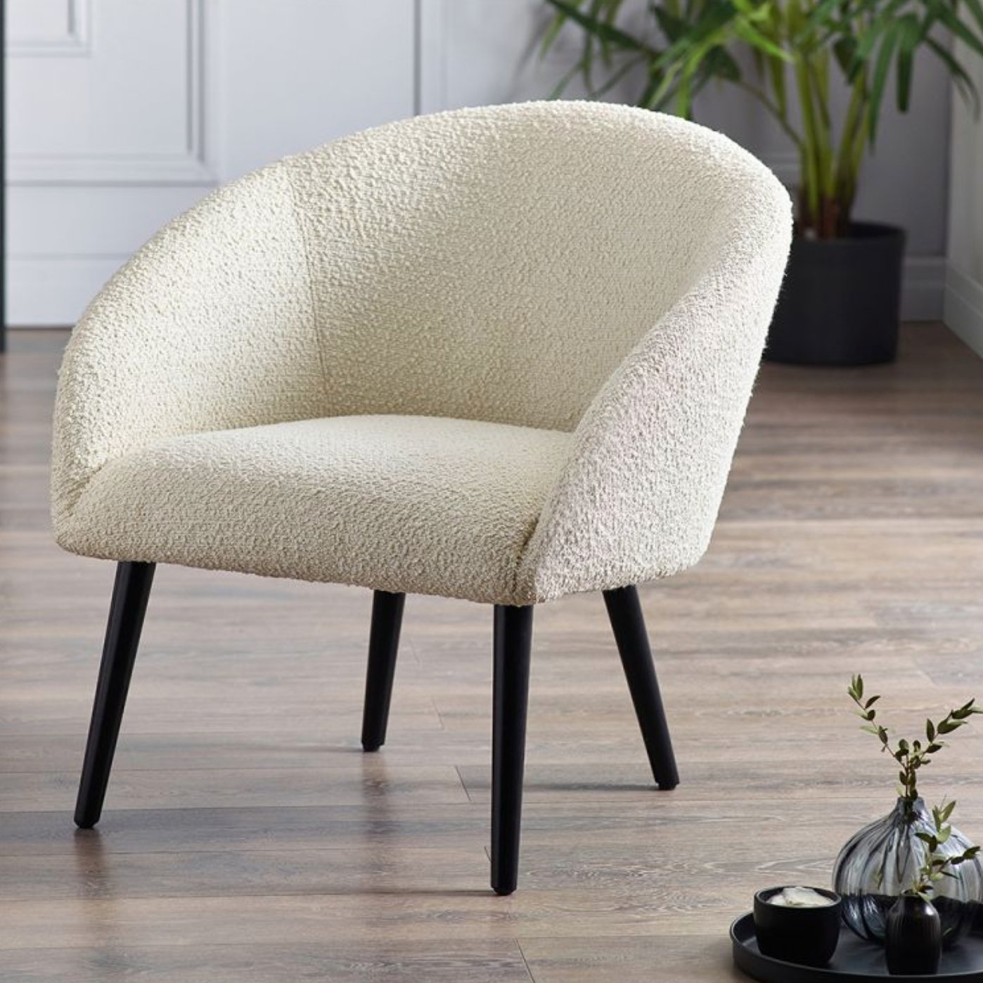This Amari accent ivory tub chair is perfect for a bedroom. Its ivory boucle loop upholstery offers a crisp simple design. The contrasting black legs provide a contemporary twist and it's perfectly on trend.