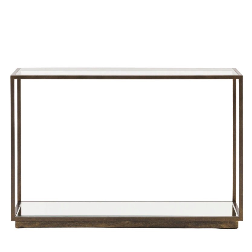 This streamlined console table suits contemporary homes beautifully. Its bronze metal frame supports a glass surface with a mirrored shelf below, offering both storage and visual lightness. The reflective shelf amplifies natural light whilst maintaining a clean, understated aesthetic ideal for modern interiors.