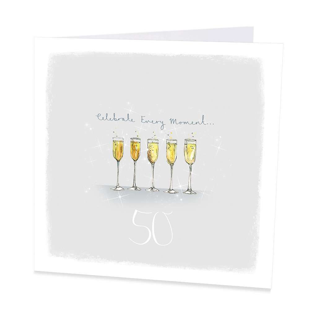 This 50th birthday/ anniversary greeting card says it all with it's 'celebrate 50' message. Featuring 5 filled and fizzing champagne flutes, the design has been delicately embellished with a subtle gold glitter finish for that extra special touch. This card is produced from sustainable wood pulp sourced from responsibly managed forests and are accredited with the FSC logo. We can send directly to the recipient with handwritten message.