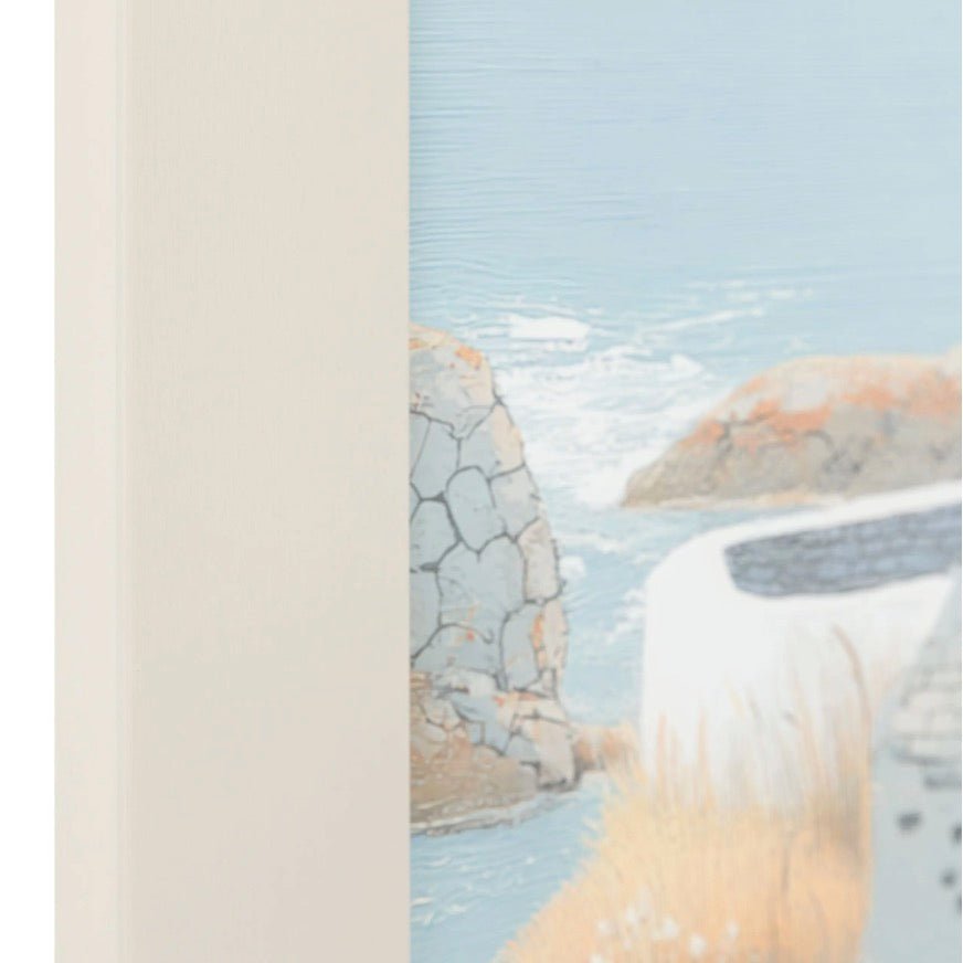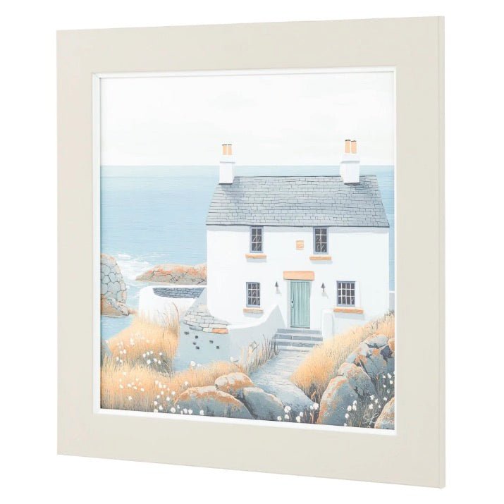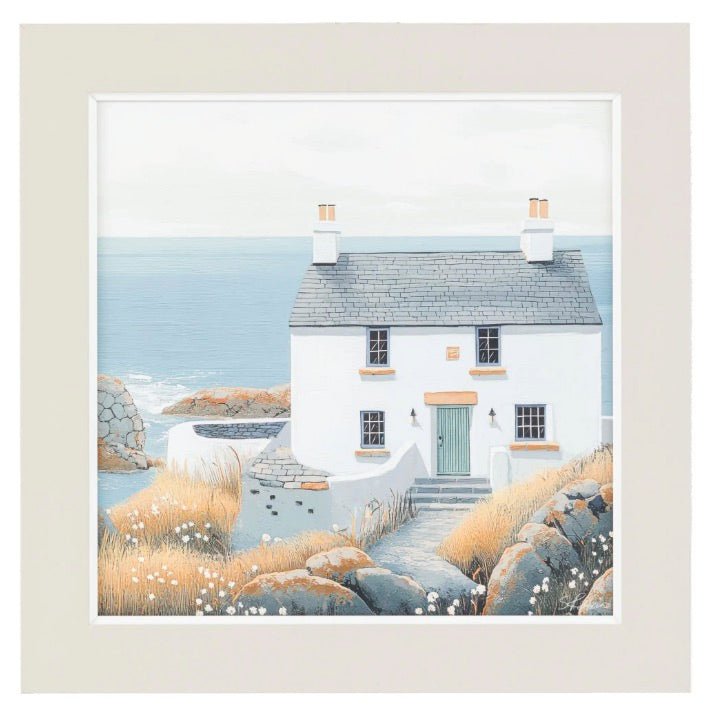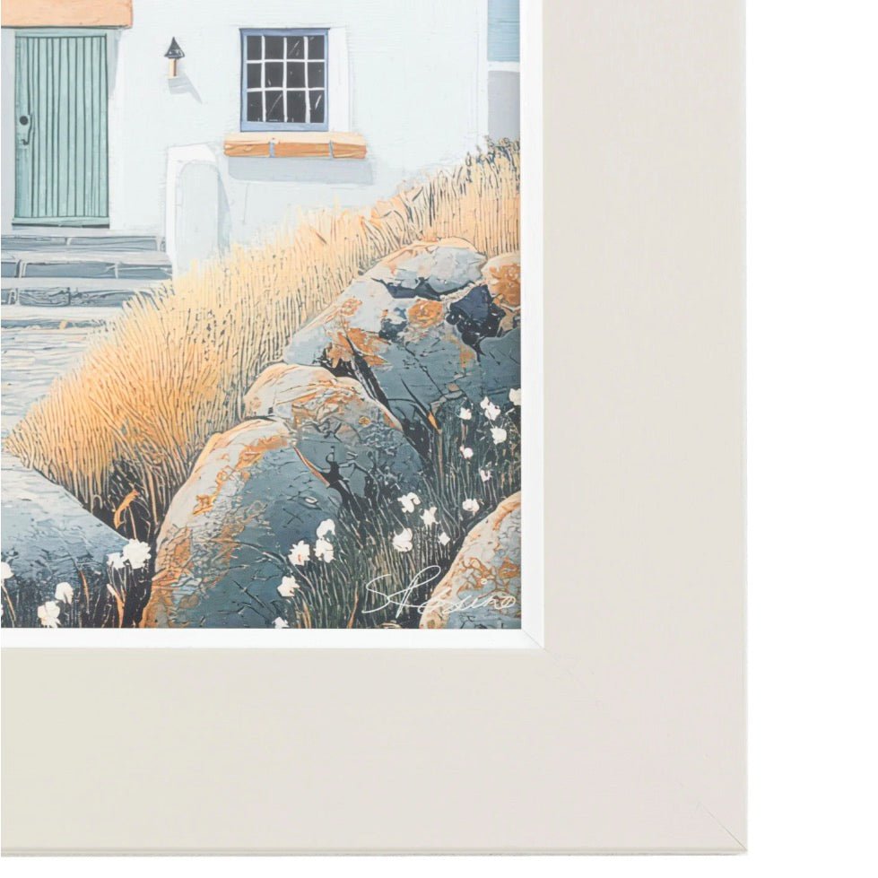 Cottage Retreat by Sabrina Roscino depicts the tranquil peace of a picturesque white seaside cottage overlooking the calm sea. It partners perfectly with Coastal Cottage by the same artist if you are looking for a pair of pictures.