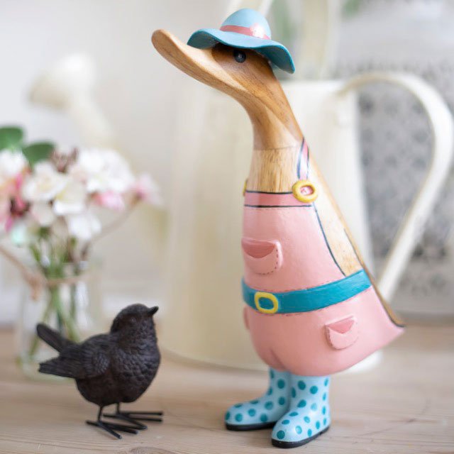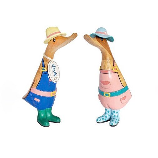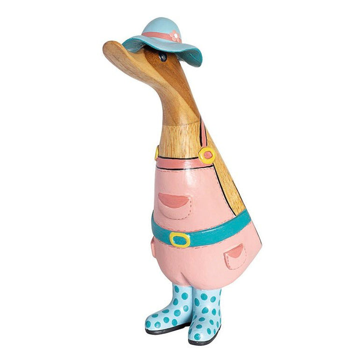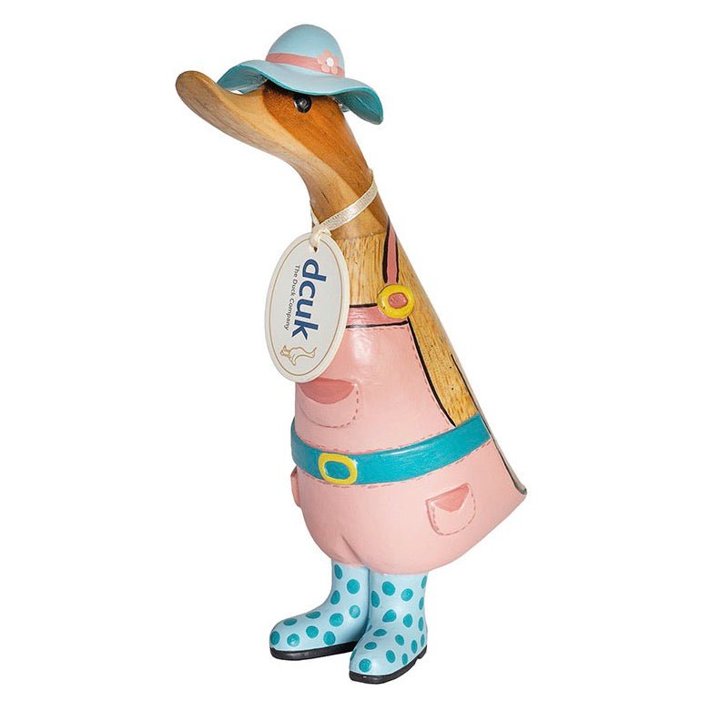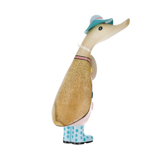 This cute wooden Gardener duckling by DCUK has a gorgeous sun hat, a pink apron and blue spotty welly boots. If you would like your duck to have a name tag, there is a choice of a randomly selected girl's or boy's name or a personalised printed name. The tag is tied with ribbon around the duck's neck. Each duck is carved from bamboo root and hand painted.