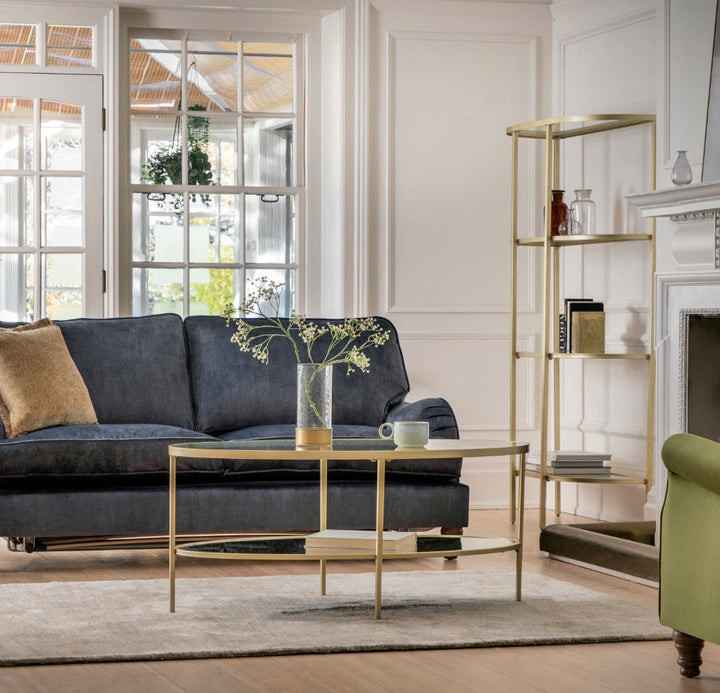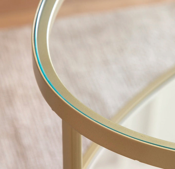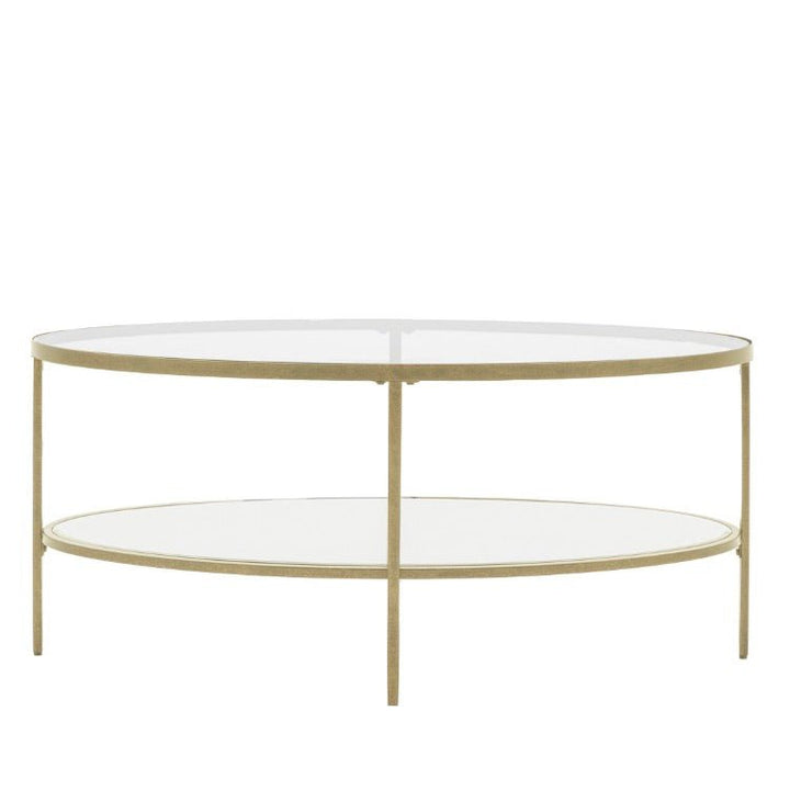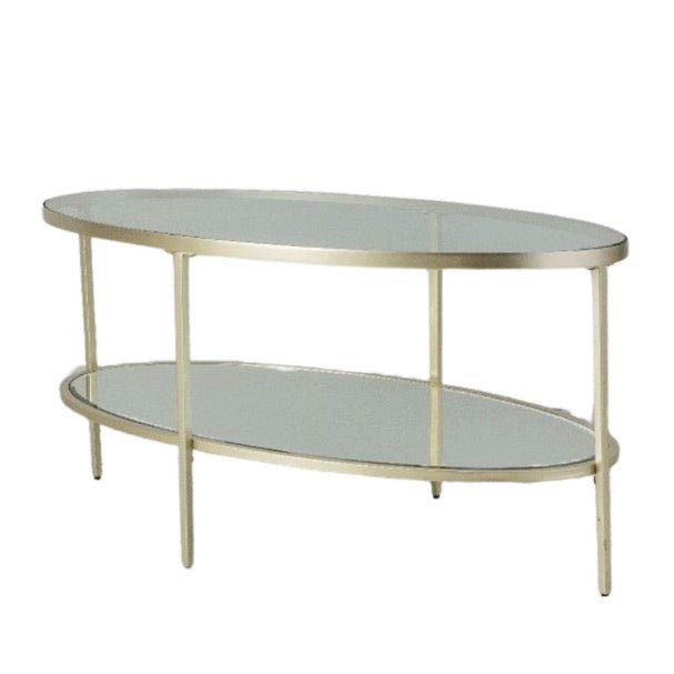 This Hudson Glass Oval Coffee Table is an elegant addition to any living space. Its champagne finish adds a touch of sophistication, while the inlaid tempered glass top provides durability and visual appeal. The mirrored shelf offers additional storage and complements the overall design, making this coffee table a must-have for any modern home.