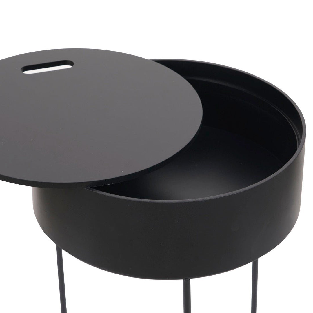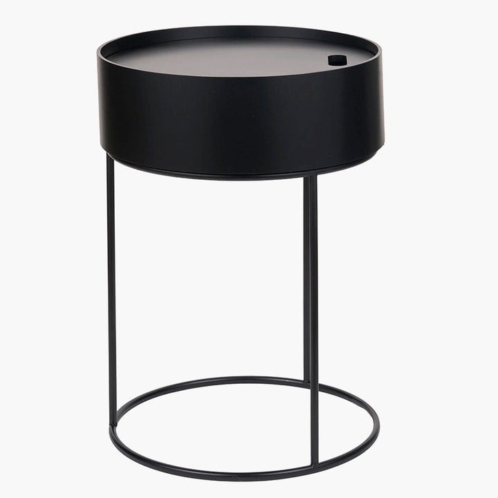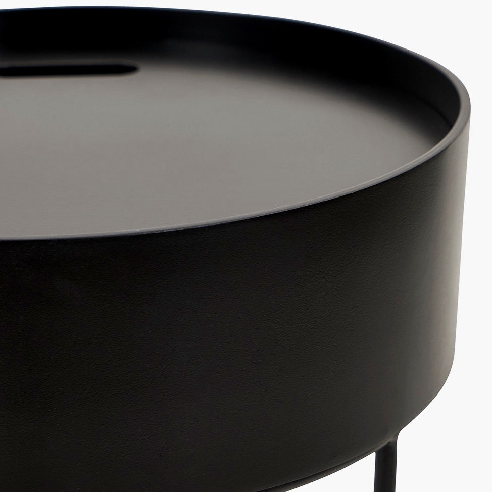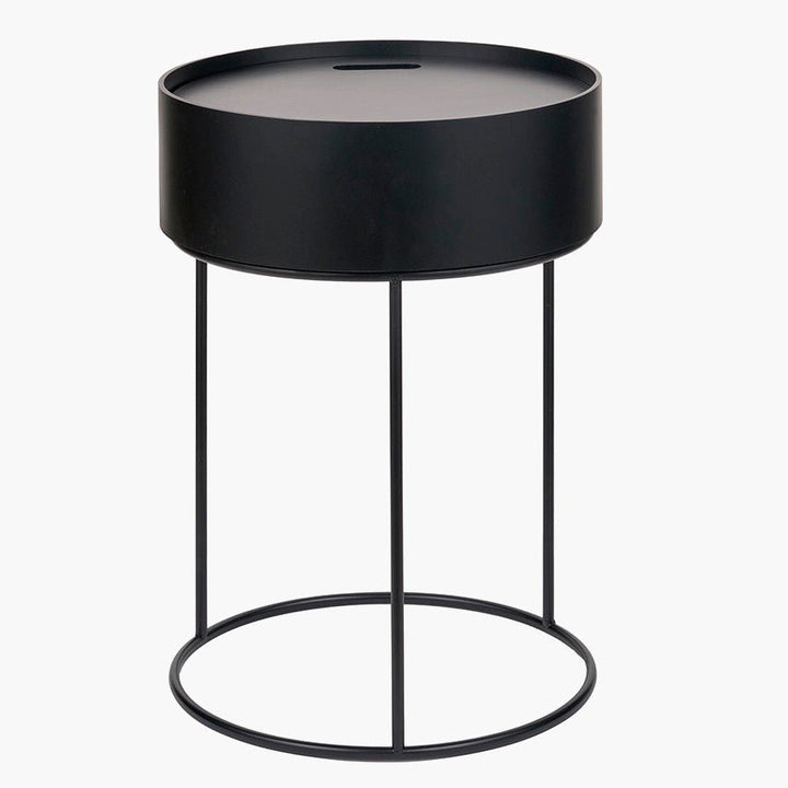 The Hugo Wood & Metal Round Storage Side Table in black offers a versatile solution for your home. Serve coffee, showcase a vase, and store miscellaneous items in its built-in compartment. Its sleek black design complements a variety of interior styles.