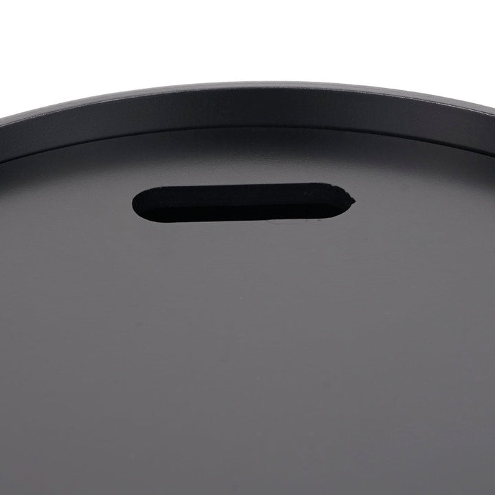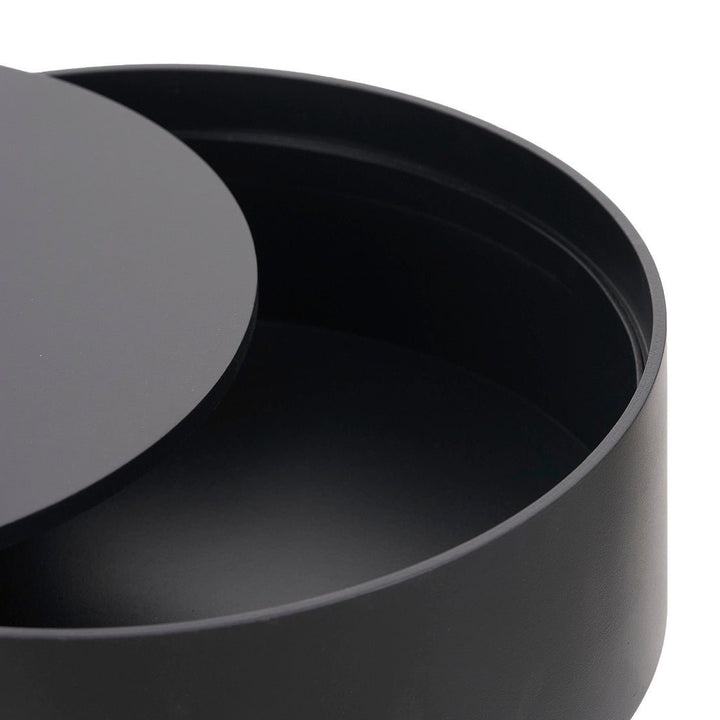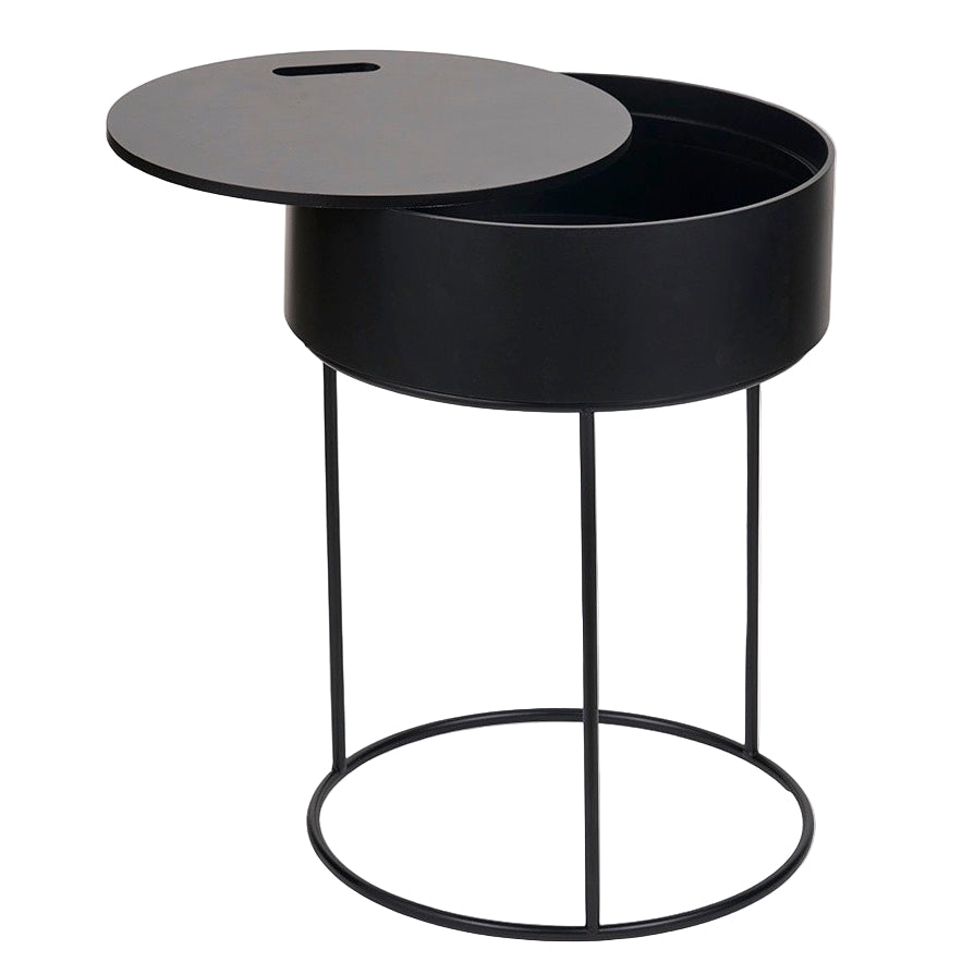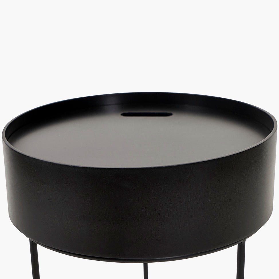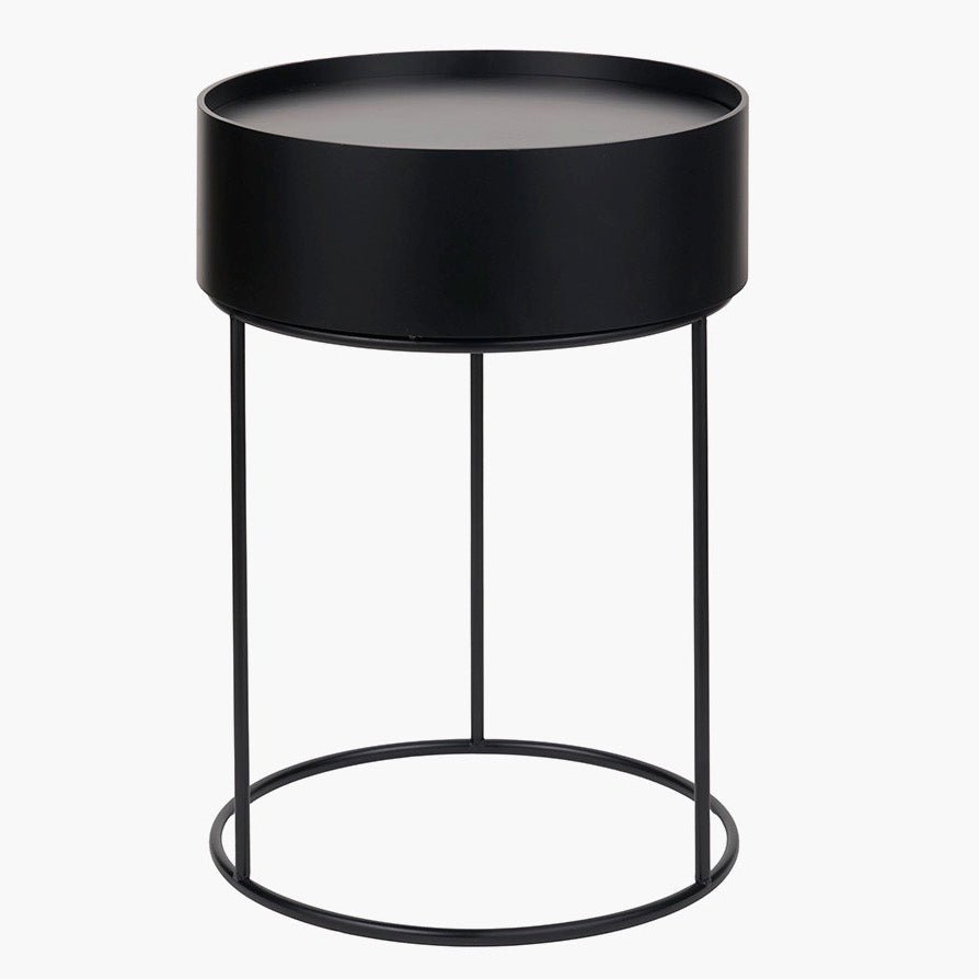 The Hugo Wood & Metal Round Storage Side Table in black offers a versatile solution for your home. Serve coffee, showcase a vase, and store miscellaneous items in its built-in compartment. Its sleek black design complements a variety of interior styles.