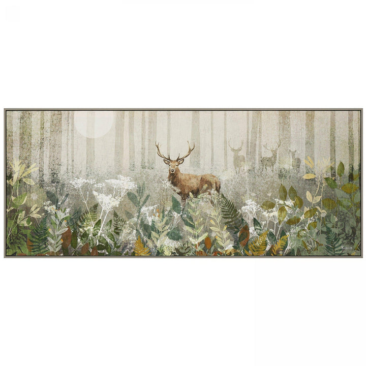 Luna Gaze by artist Sabrina Roscino is a gorgeous picture of Stags and deer enjoying the woodland country side in the hazy sunshine. Ideal for a lounge or hallway and perfect for above a sofa. Framed wrapped canvas.