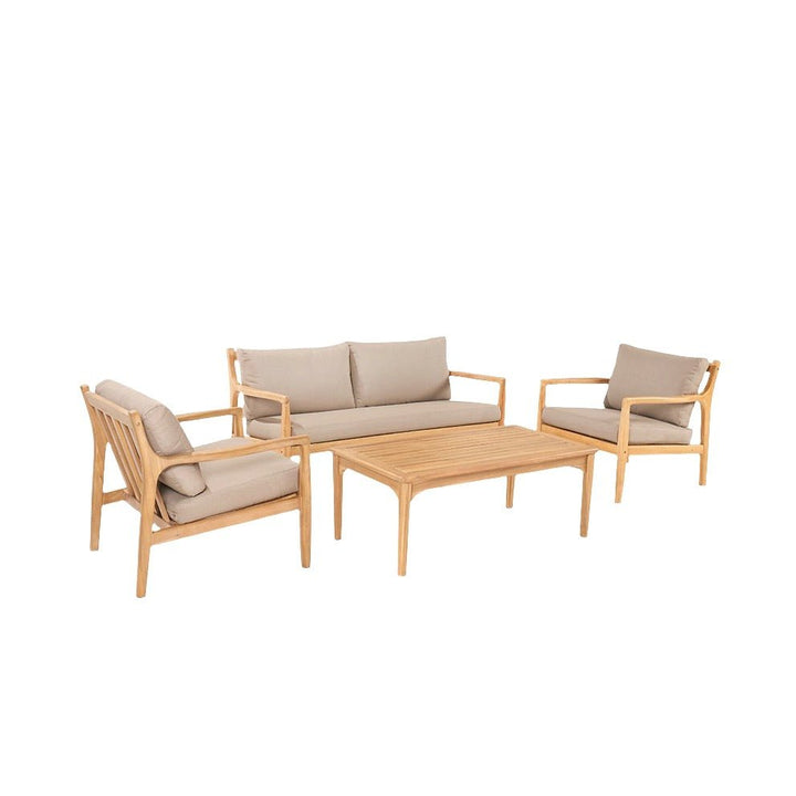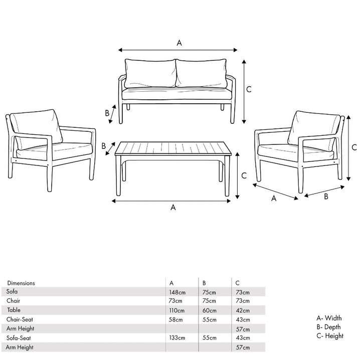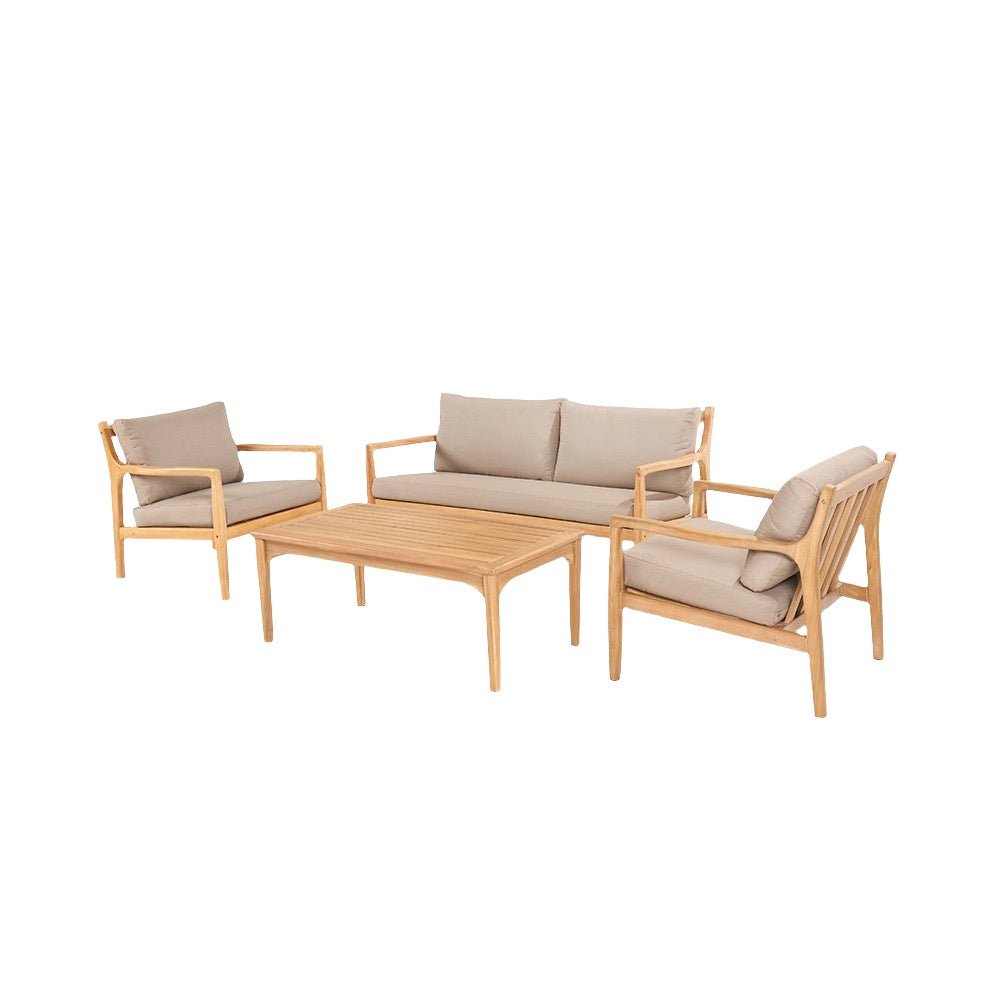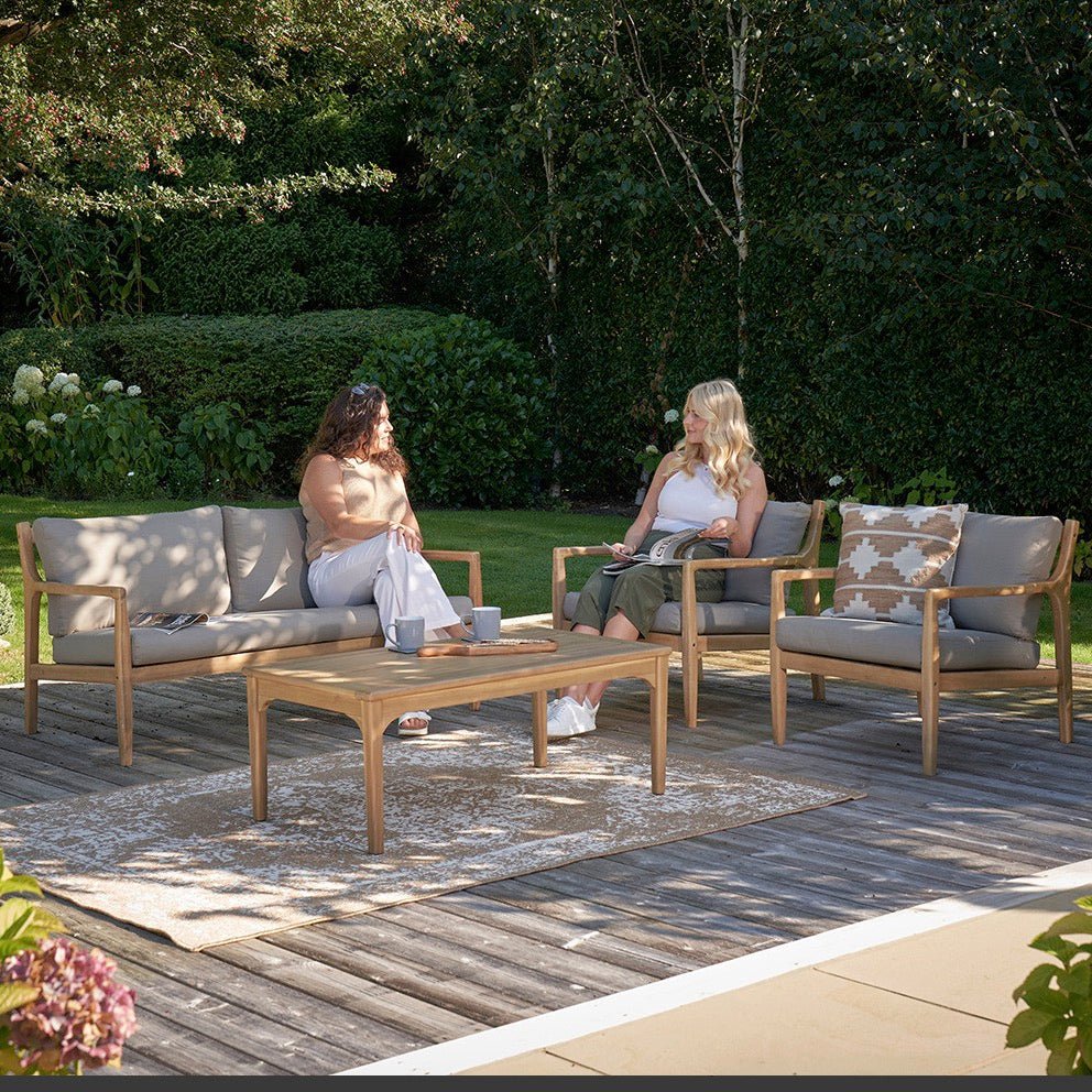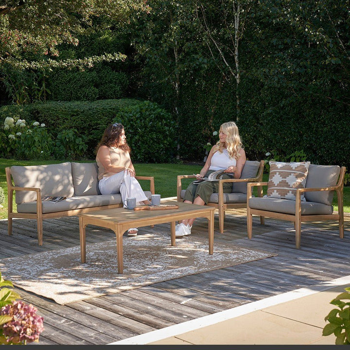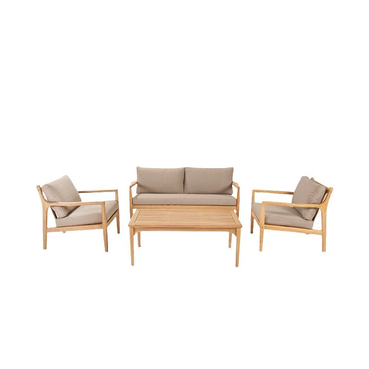 The Malta Outdoor Seating Set offers a fresh, modern look to any outdoor or indoor space. This set includes a 2-seater sofa, 2 armchairs, and a rectangular coffee table, all featuring a light teak effect acacia wood frame and light linen taupe fabric cushions. The sleek and slimline design of the acacia wood is not only stylish, but also environmentally friendly as it is made from a fast-growing hardwood. Additionally, the high-quality cushions are both fire retardant and weather resistant, ensuring long-lasting comfort and durability.