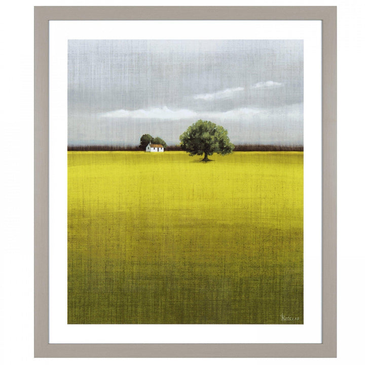 Morning Warmth by Sabrina Roscino will do exactly that with its gorgeous bright green field with a cottage and tree in the distance. Framed and glazed with a wide white background. It partners perfectly with Evening Glow by the same artist if you are looking for a pair of pictures.