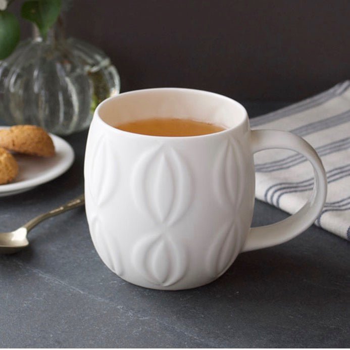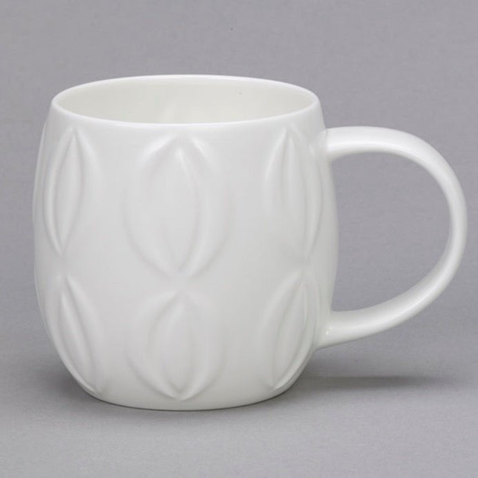 The Plum Pod white bone china mug has raised 3D pod motif patterns. It has a distinct plum-like shape which is comforting to hold, and features an embossed dimpled pattern. The bone china mugs are made the traditional way, starting with liquid clay poured into a mould by hand. The mug then goes through around 20 hand processes, as well as three firings in a kiln before it is ready. It makes a simple cup of tea or coffee feel that little bit more special.
