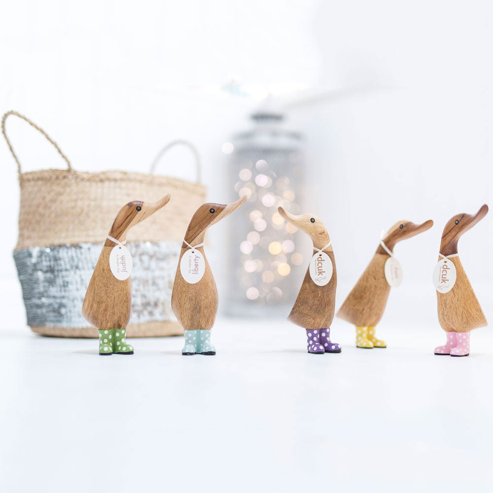 Wooden Duckling in Green and White Spotty Wellies1 - Duck Barn Interiors