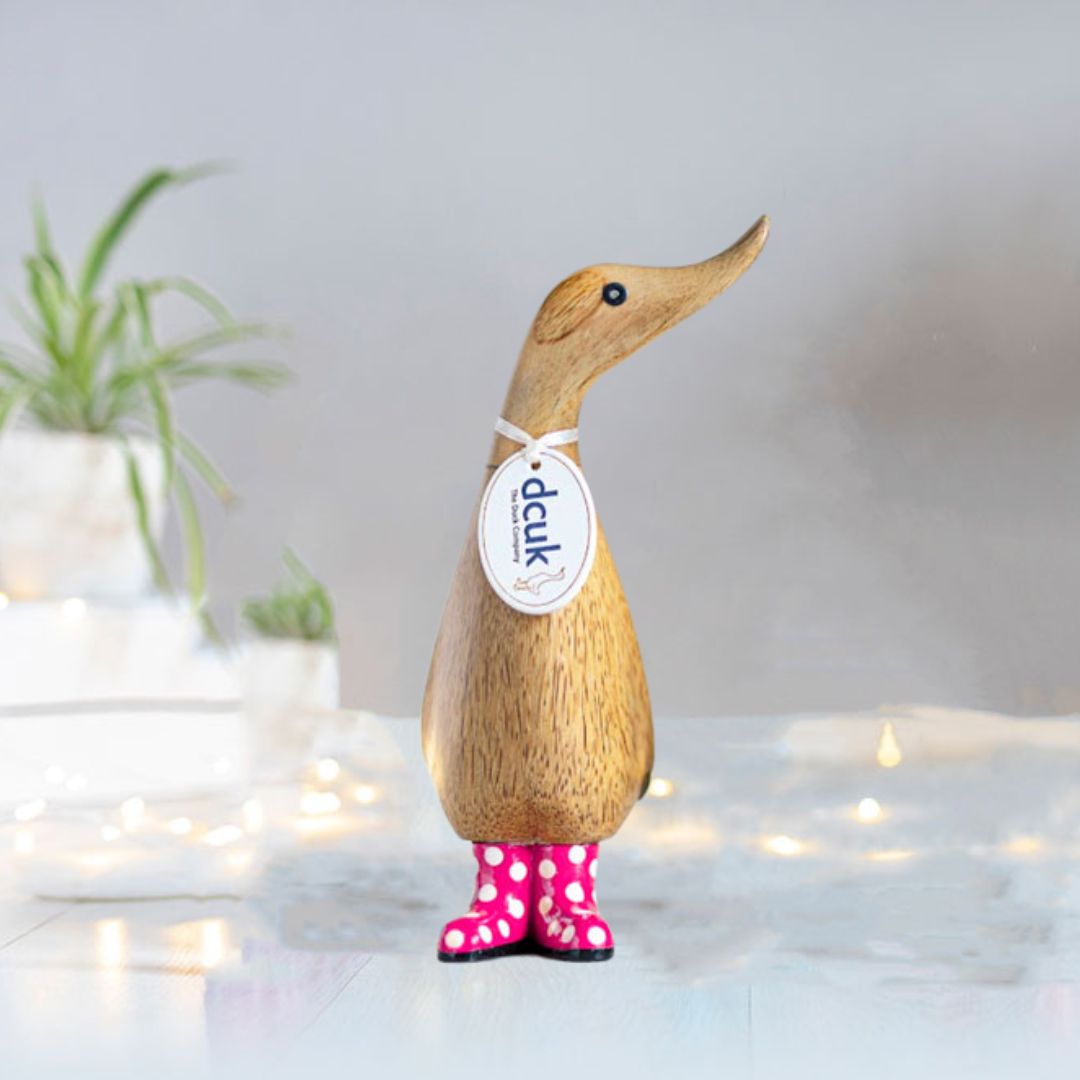 Wooden Duckling in Bright Pink and White Spotty Wellies1 - Duck Barn Interiors