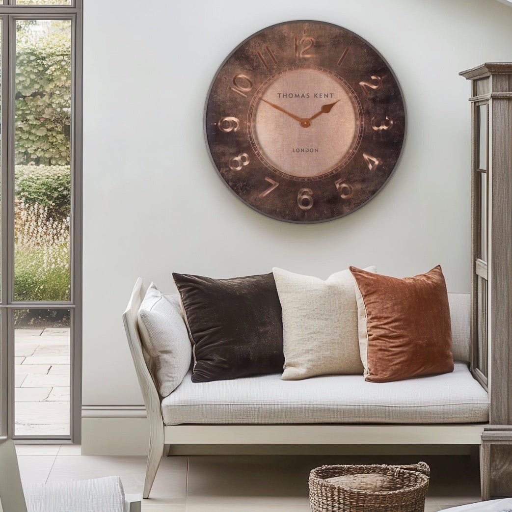 This extra large contemporary wall clock boasts a modern twist with a warm brown finish and subtle stone effect. The rose gold textured backdrop and metallic hands exude a sense of luxury, while the etched modern numbers and ticks add a touch of drama. A matte coffee brown rim completes the stunning design, creating a warm and inviting ambience in any interior.