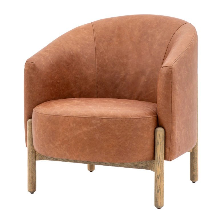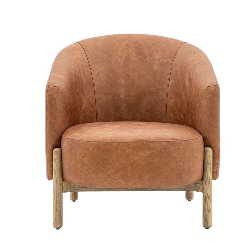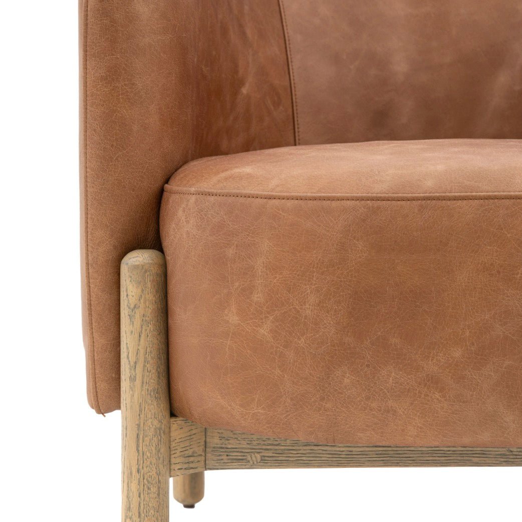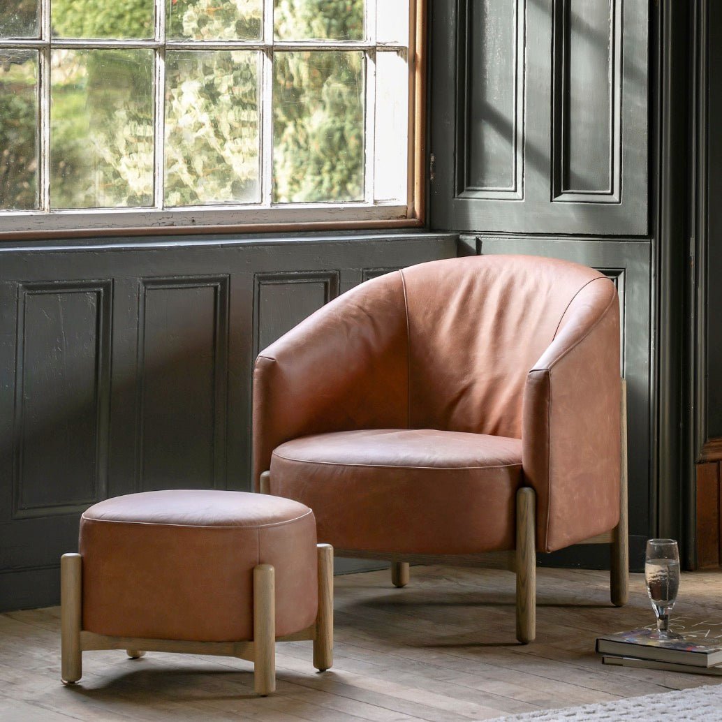 This elegant armchair is versatile enough to fit into any interior design scheme. The deep seat and gracefully curved back are covered in a vintage-style brown leather that complements the exquisite wooden frame and legs. Also available with matching footstool.