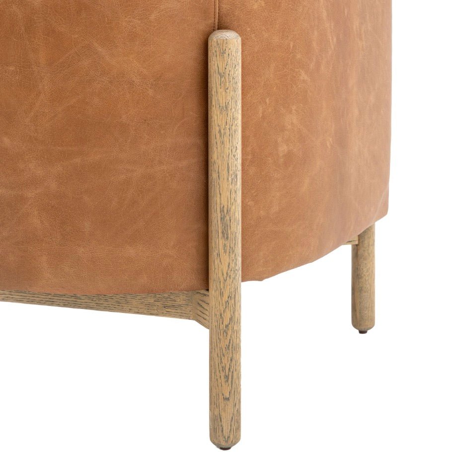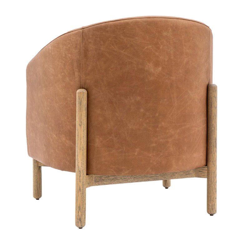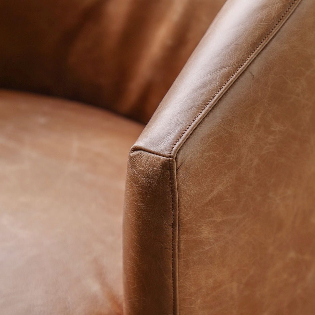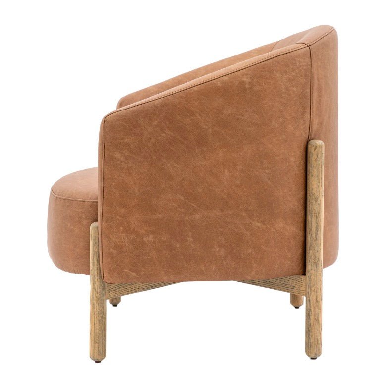 This elegant armchair is versatile enough to fit into any interior design scheme. The deep seat and gracefully curved back are covered in a vintage-style brown leather that complements the exquisite wooden frame and legs. Also available with matching footstool.