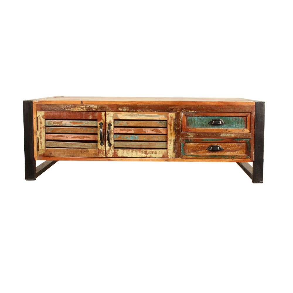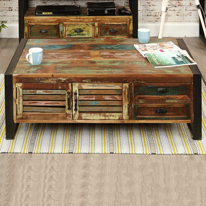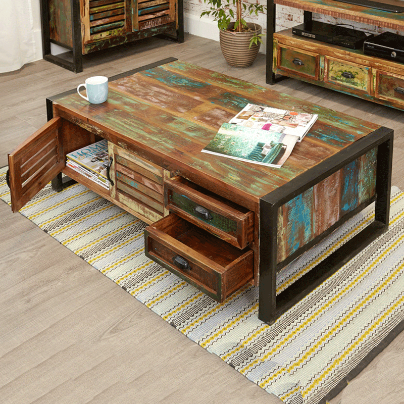 This unique Urban Chic contemporary large coffee table has two cupboards and four drawers for practical storage. The exclusive range is made using reclaimed wood salvaged from India. Some of the wood used can range between 50 and 150 years old and is assembled by skilled craftsmen who create this colourful and interesting furniture.