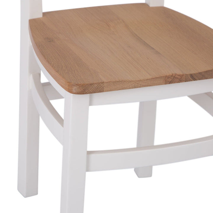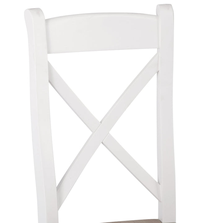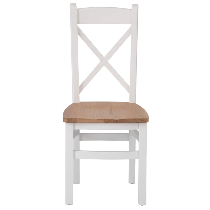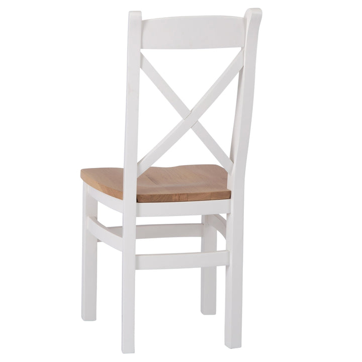 This Windsor White cross back dining chair has a wooden seat which perfectly matches the dining tables in the same range. The high back rest provides extra support and the seat is shaped for comfort. Sold and priced as a pair.